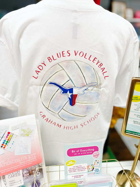 Vendor:Agency of SaintsRegular price $35.00 USDRegular priceUnit price / perVolleyball Pattern White Tee | Lady Blues Volleyball | LBVB Game Day Tee