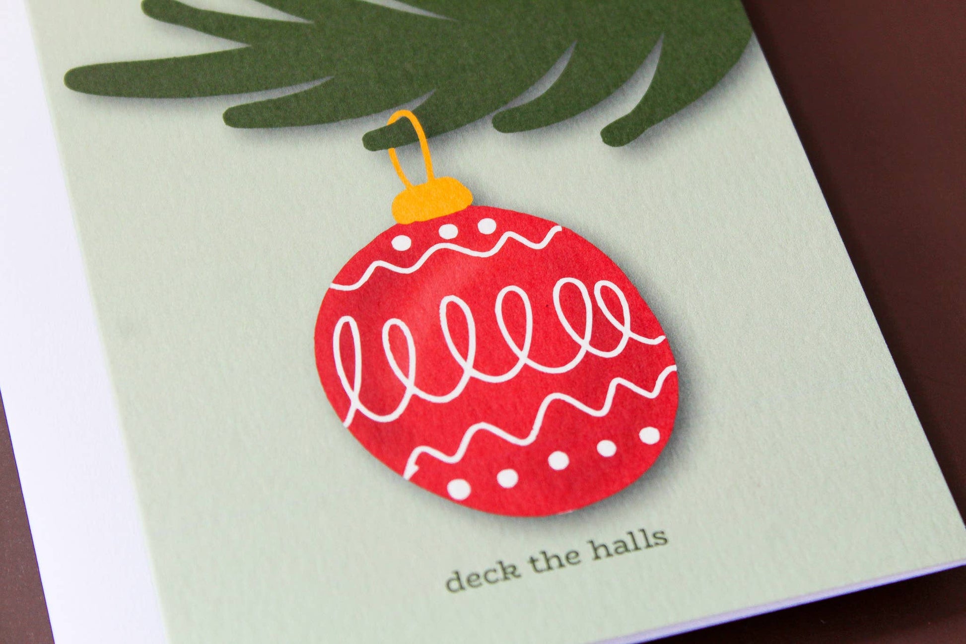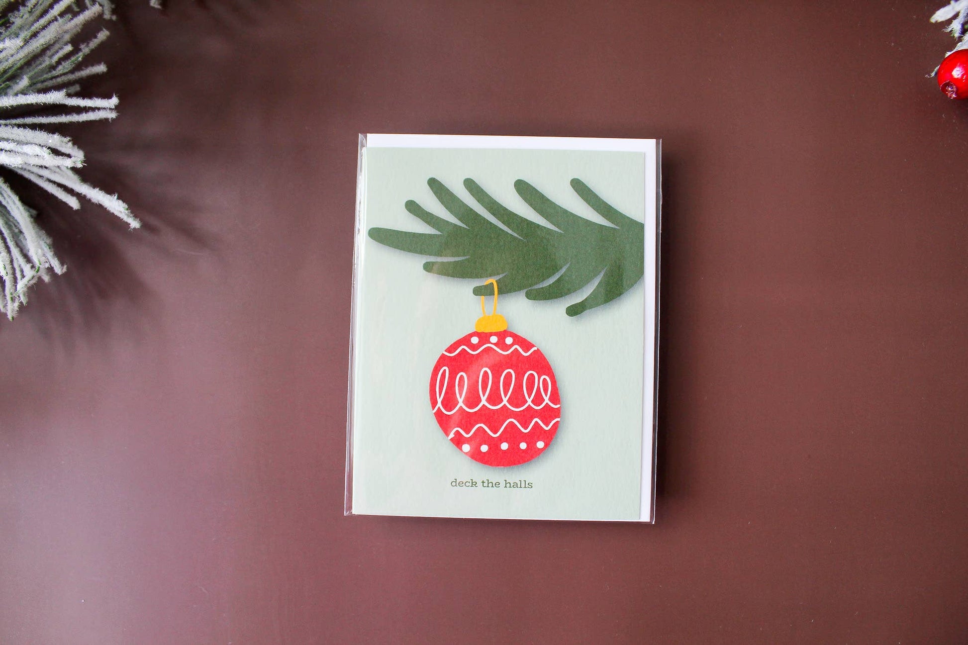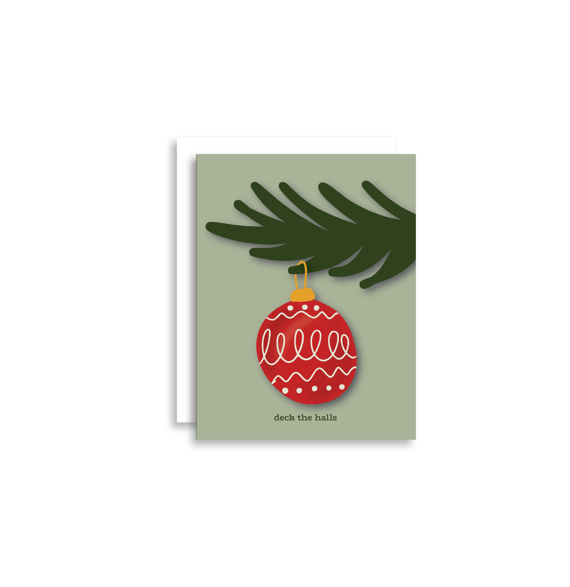 This holiday greeting card features a red illustrated vintage Christmas ornament.