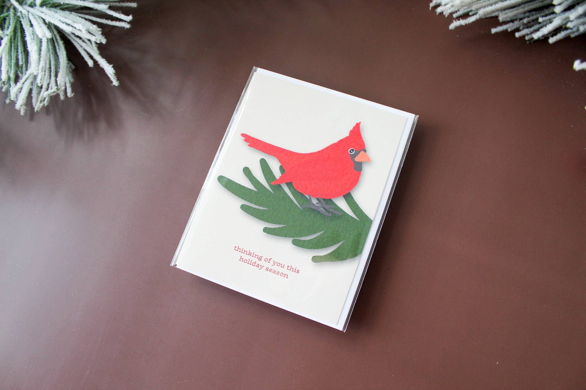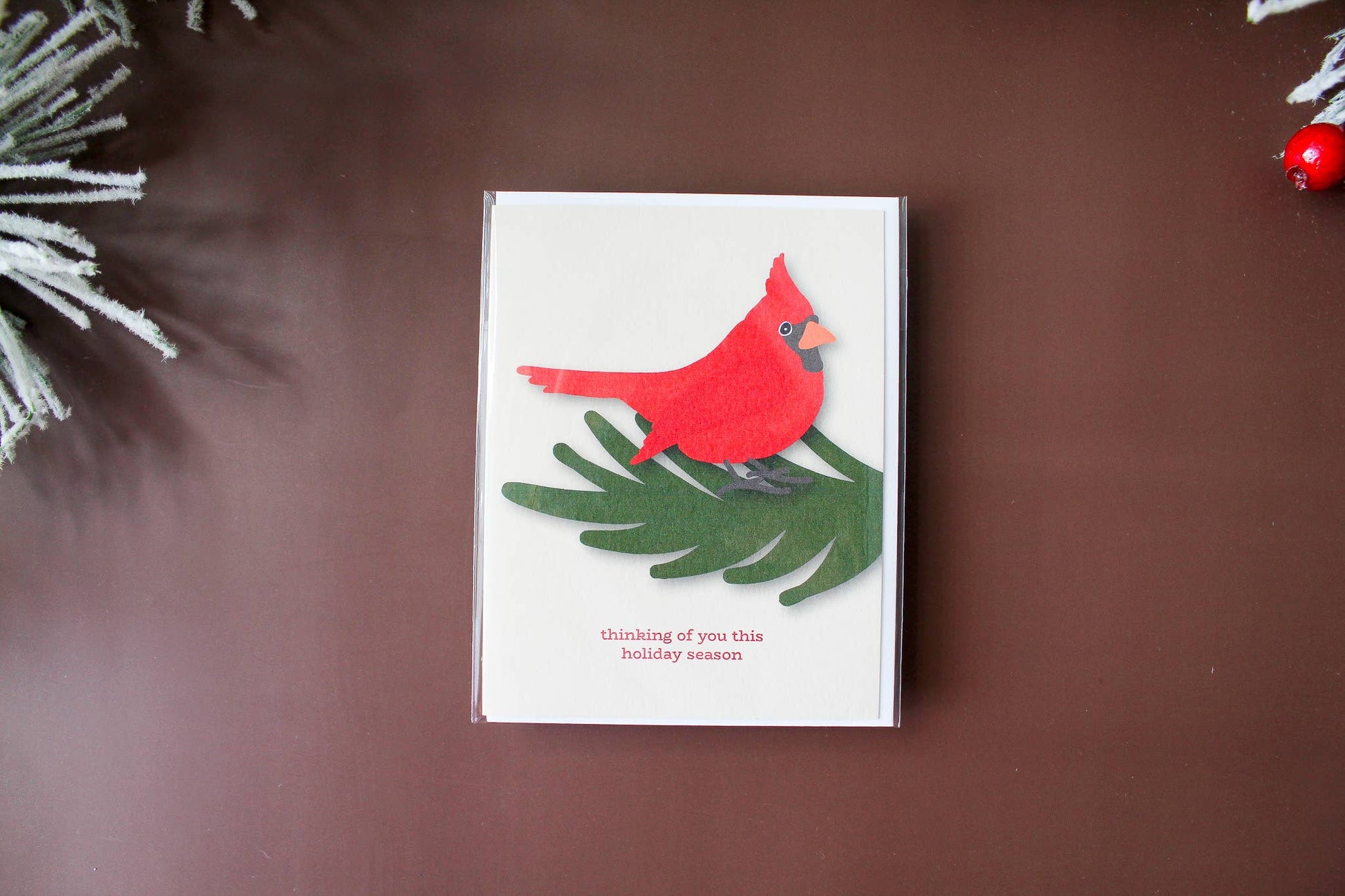 This holiday greeting card features an illustrated Christmas red bird.